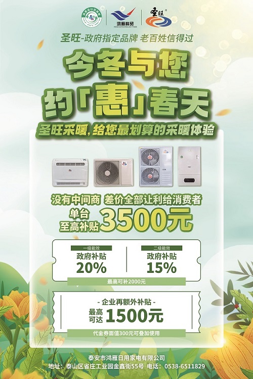 在這個寒冷的季節(jié),選擇圣旺品牌的空氣源熱泵熱風機、燃氣壁掛爐及空氣能機組等采暖設(shè)備,不僅能享受優(yōu)惠補貼,更是為環(huán)保貢獻一份力量。歡迎廣大消費者前來選購,讓我們一起溫暖過冬!