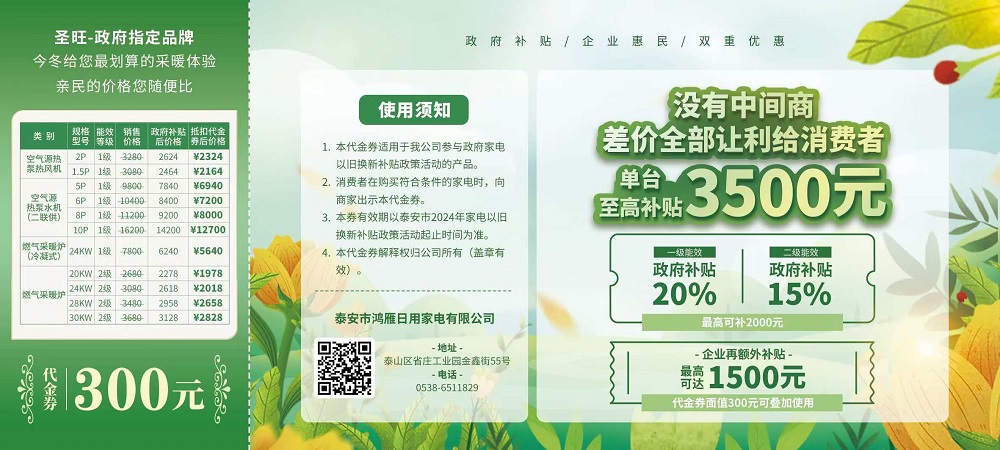 如今,泰安市舉行家電以舊換新補貼政策,我公司三類產(chǎn)品成功入圍,包括空氣源熱泵熱風機、冷水機組和燃氣壁掛爐。消費者購買我公司一級能耗產(chǎn)品可享受政府 20%的補貼,二級能耗產(chǎn)品可享受 15%的補貼。在此基礎(chǔ)上,我們面向全市消費者再額外發(fā)放 300 萬的代金券,單張面值 300 元,共 1 萬張。這意味著在政府補貼的同時,消費者還能享受我公司讓利 300 至最高 1500 元的優(yōu)惠,真正實現(xiàn)政企雙補,福利翻倍。